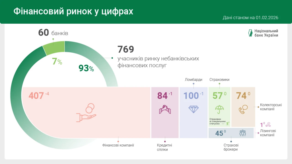 Станом на 01 лютого 2026 року на ринку небанківських фінансових послуг працювало 407 фінансових компаній (було 411), 47 страховиків non-life (кількість не змінилася), 10 life-страховиків (кількість не змінилася), один страховик зі спеціальним статусом, 100 ломбардів (був 101), 84 кредитні спілки (було 85), один лізингодавець (кількість не змінилася), 45 страхових брокерів (кількість не змінилася) та 74 колекторські компанії (кількість не змінилася).